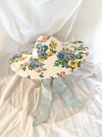 The main fabric is a repurposed vintage duvet cover, with the original edging used as piping for the brim. The lining is made of deadstock cotton seersucker, with a hand-stamped label to reduce waste.